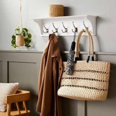 This Wood Entryway Shelf from Threshold™ features a white wooden shelf that offers a top space for storage and display. It comes with five silver-finish hook points for hanging hats, coats, jackets, belts or other items. Mount it on a wall in your laundry room, bathroom, entryway or kitchen to maximize storage space.